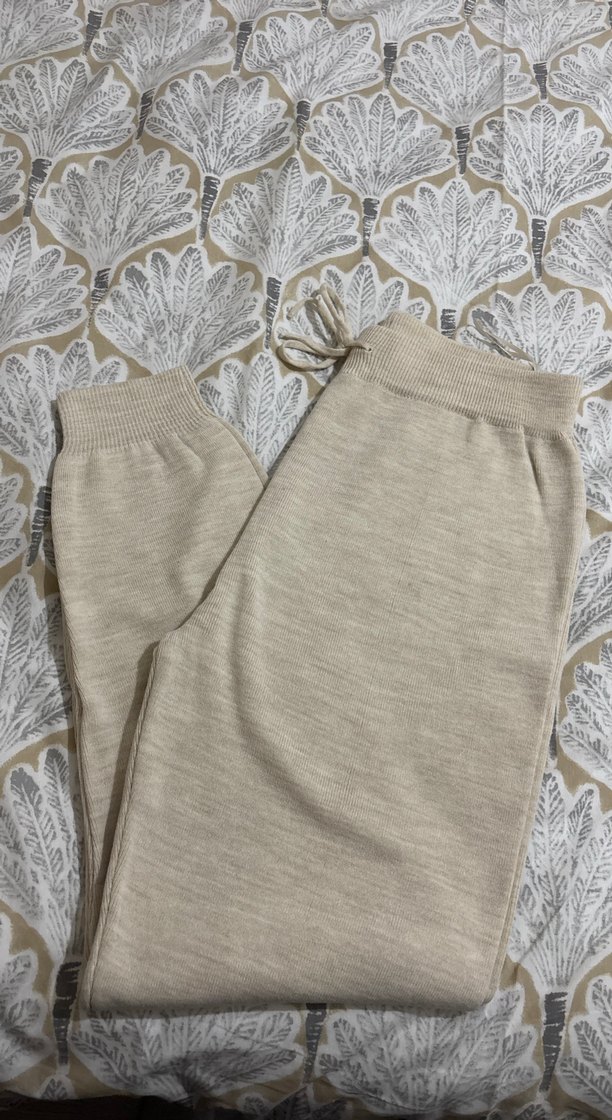 Bej renkli, örgü kumaştan, kadın eşofman. Rahat ve günlük kullanıma uygundur.