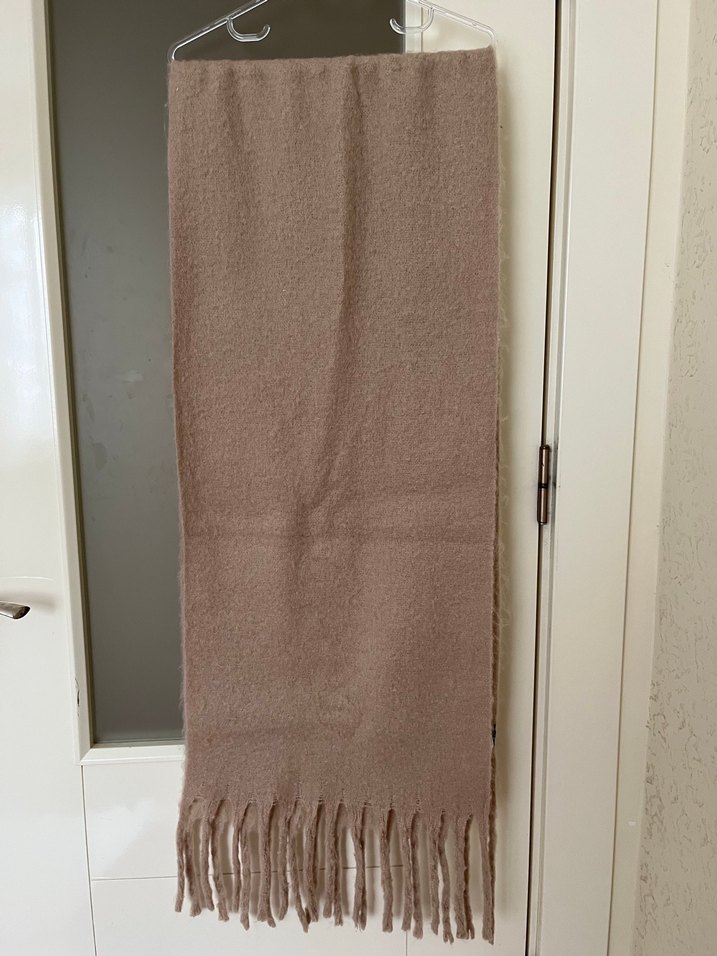 Bej renkte, örgü dokulu ve püsküllü kadın şalı. Yumuşak sentetik kumaştan, sade ve bohem tarzlara uygun.