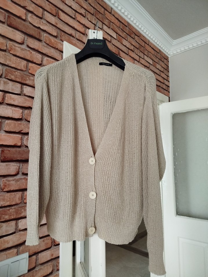 etiketinde S beden yazıyor fakat xl kadar olur esneme payı yüksek .bej renkli, örgü dokulu, uzun kollu ve notched lapel yakalı, normal midi boyda, bol kesim kadın hırka. Günlük kullanıma uygun, rahat ve şık bir parça.