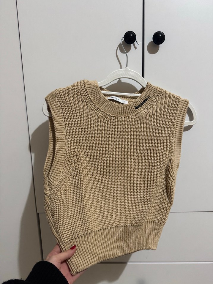 Bej renkli, yuvarlak yakalı, örgü örme kadın süveter. Kolsuz ve vücuda oturan kesimiyle rahat ve şık bir görünüm sunar. Alındı alılalı 1-2 kez giyildi siyah gömlekle kombinlemek çok zevkli oluyor yazın ise siyah bir şortla çok tatlı olabilir