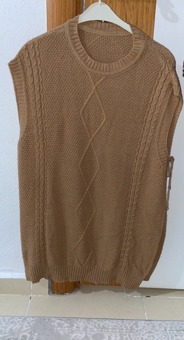 Bej renkli, örgü dokulu, yuvarlak yaka ve kolsuz kadın süveter, rahat ve salaş kesim ile günlük sokak stiline uygundur.