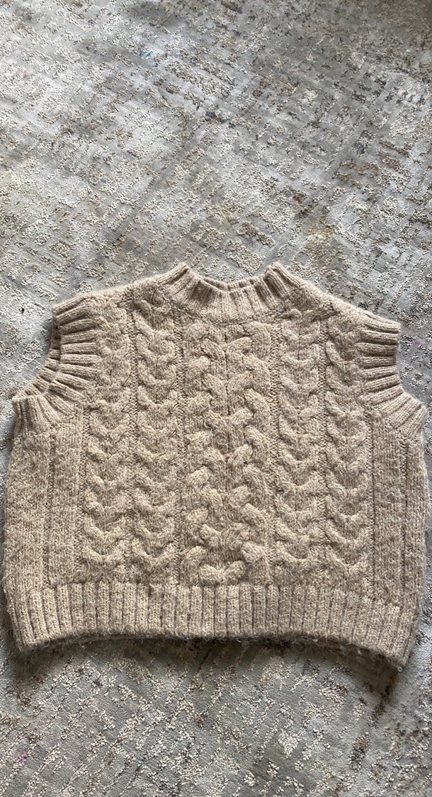 Bej renkli, örgü dokulu, yuvarlak yaka ve kolsuz çocuk süveter. Rahat ve bol kesimli, günlük kullanıma uygun klasik örgü deseniyle.