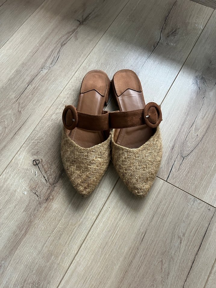Bej renkli, örgü dokulu ve tokalı kadın terlikleri. Minimalist bohem tarzında, günlük kullanıma uygun, desensiz tasarım.