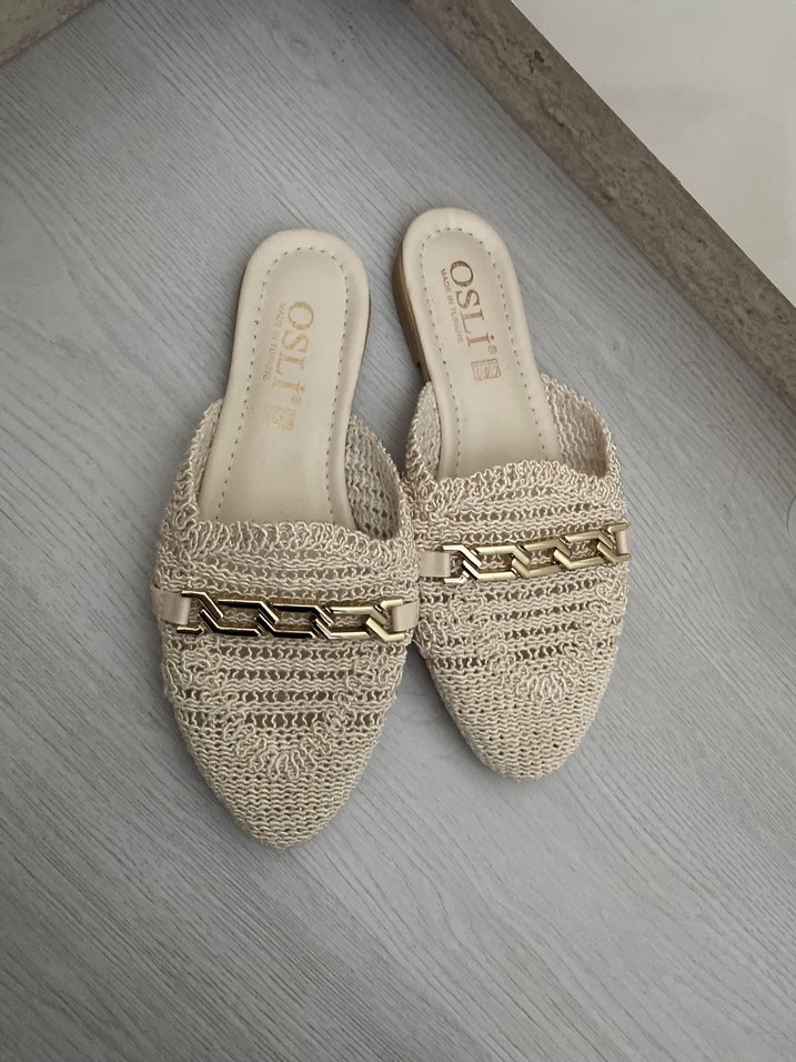 Bej renkli, örgü dokulu ve yılan deseni detaylı kadın topuklu terlik. Günlük kullanıma uygun, rahat ve şık. Marka: OSLI'E