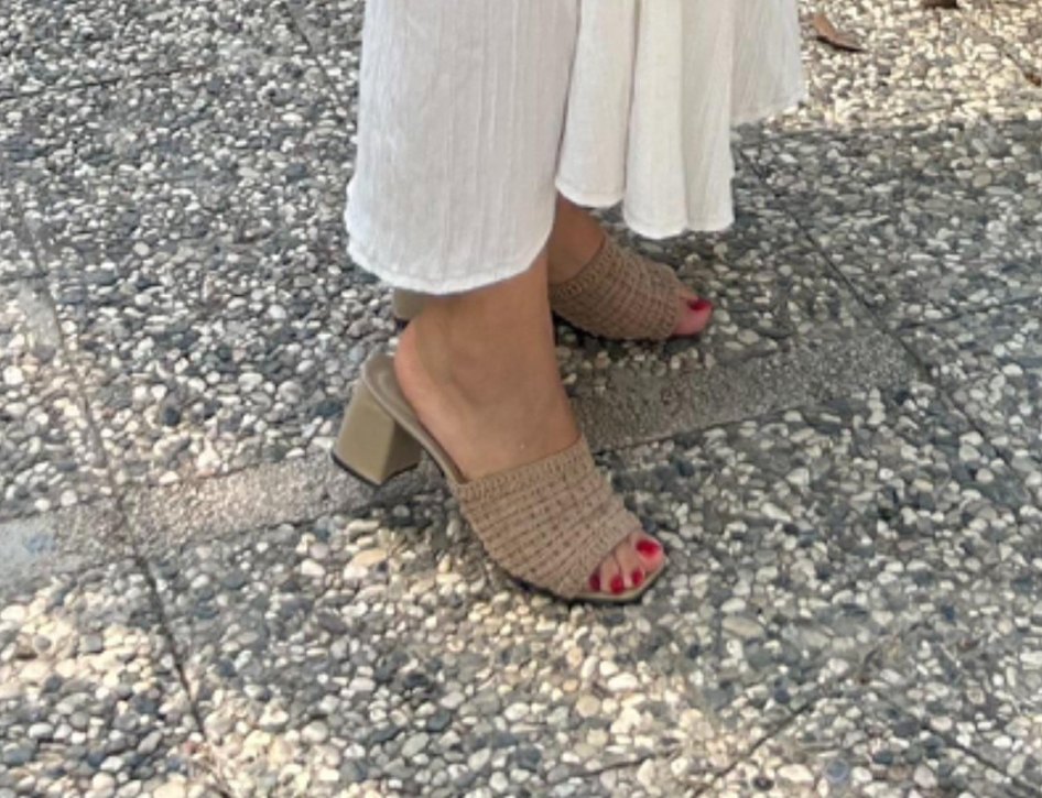 Bej renkli, örgü kumaştan yapılmış kadın topuklu terlikler. Blok topuklu ve desen içermeyen tasarımıyla günlük kullanıma uygundur.