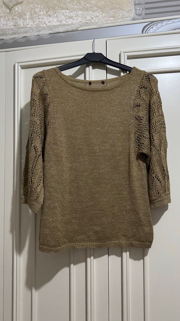 Bej renkli, örgü kumaştan yapılmış, uzun kollu ve açık örgü detaylı, yuvarlak yaka, bol kesim kadın triko Rahat ve bohem tarzda günlük kullanıma uygun.