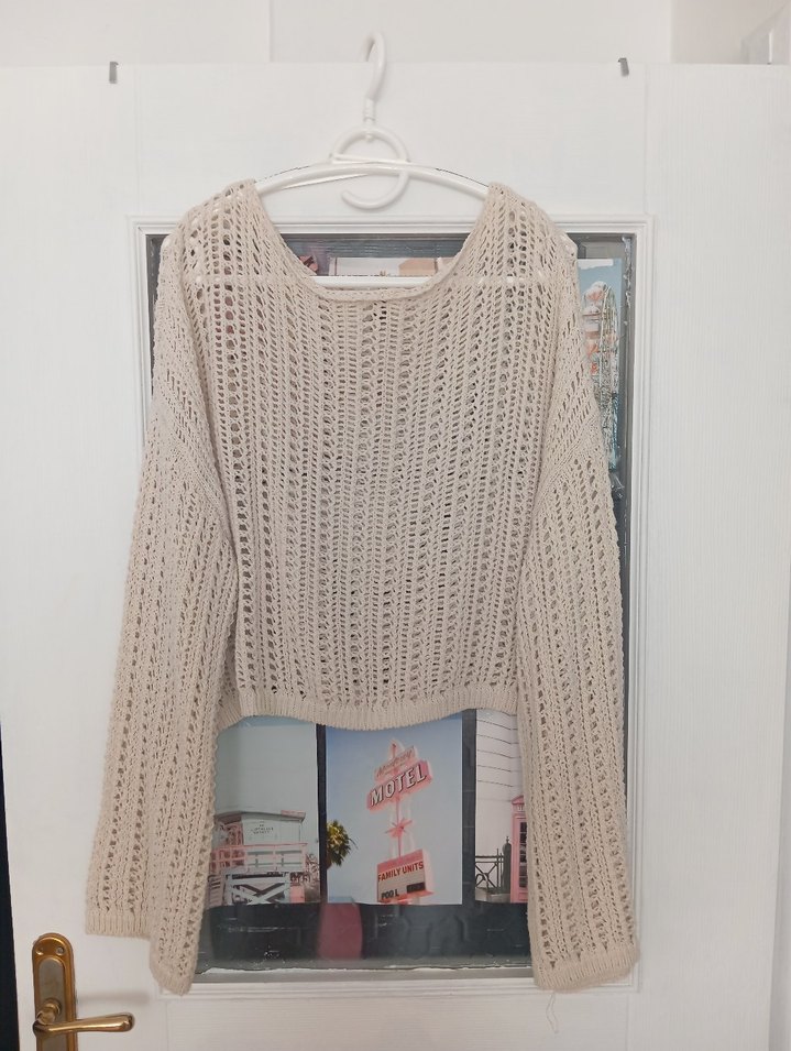 Bej renkli, uzun kollu, yuvarlak yaka ve bol kesim örgü kadın triko kazak. Rahat ve günlük kullanıma uygun.