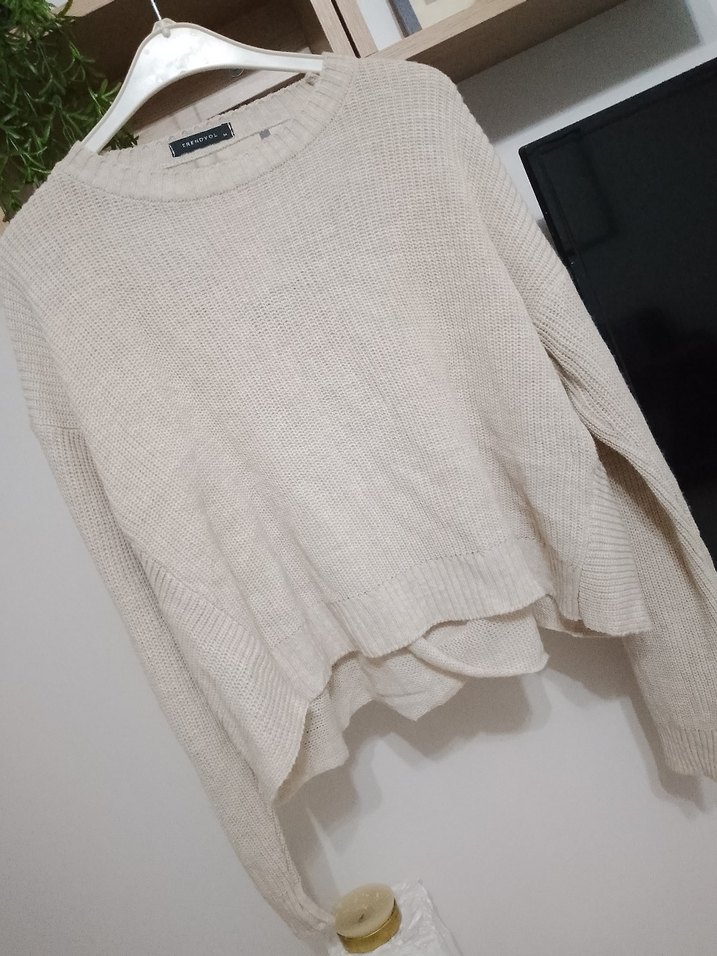 Bej renkli, örgü dokulu, keten kumaştan yapılmış, yuvarlak yaka ve uzun kollu, bol kesim kadın triko kazak. Günlük ve sokak stiline uygun.