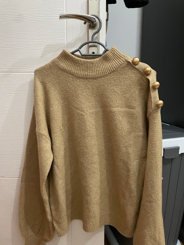 Bej renkli, örgü triko kazak. Bisiklet yaka ve uzun kollu, omuzda düğme detayları bulunur. Rahat kesimli, günlük kullanıma uygun bir model. Ürün fazlalığıııı