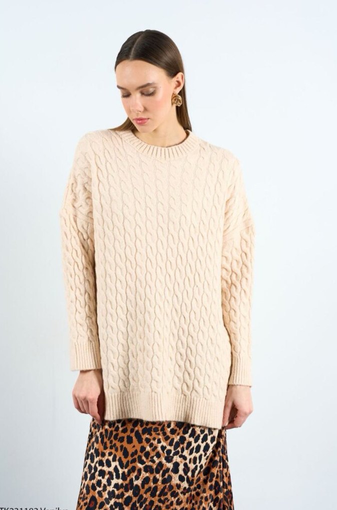 Bej renkli, örgü dokulu, salaş kesim, bisiklet yaka ve uzun kollu triko kazak. Standart bedenlerdedir. 36-42 arası uyumludur.