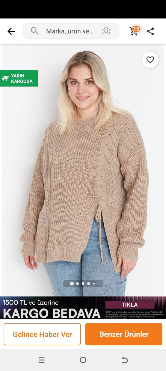 Bej renkli örgü triko kazak, bol kesim, uzun kollu ve bisiklet yaka detayına sahiptir.cok beğendiğim bir kazak ama bana bol geliyor fotoğrafta ekledim öyle hafif ip kaçağı var