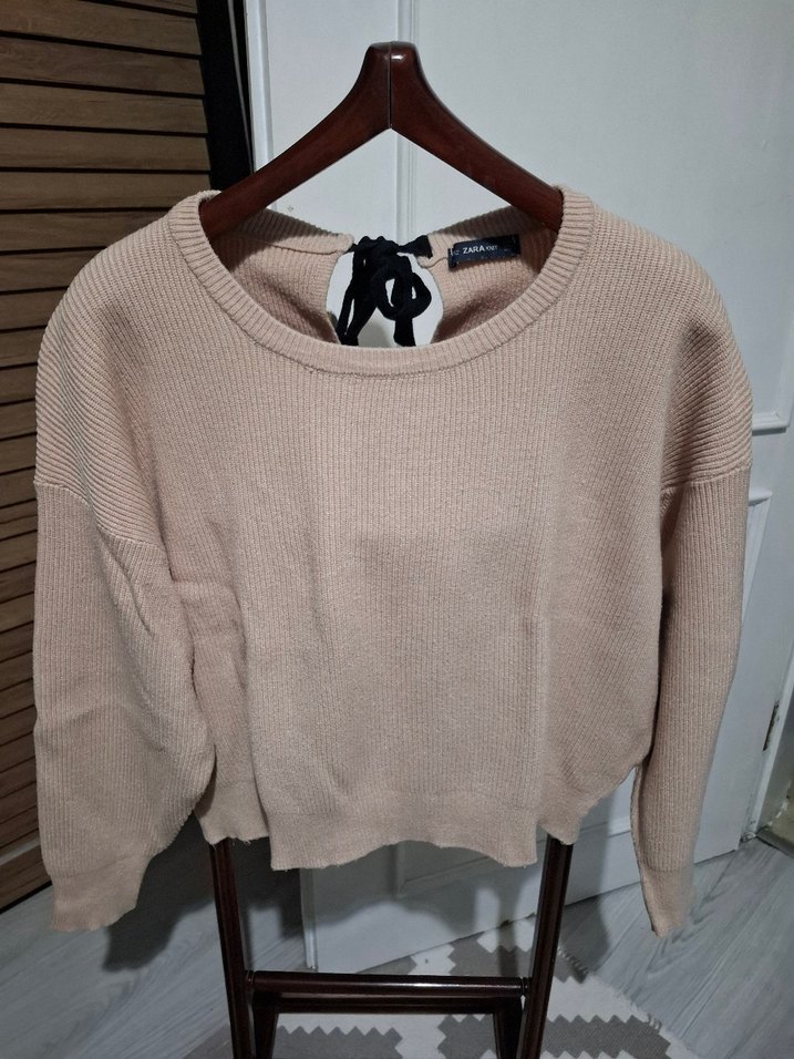 Bej renkli, örgü kumaştan yapılmış, yuvarlak yaka ve uzun kollu, bol kesim kadın triko kazak. Günlük kullanıma uygun rahat ve sade tasarım.
