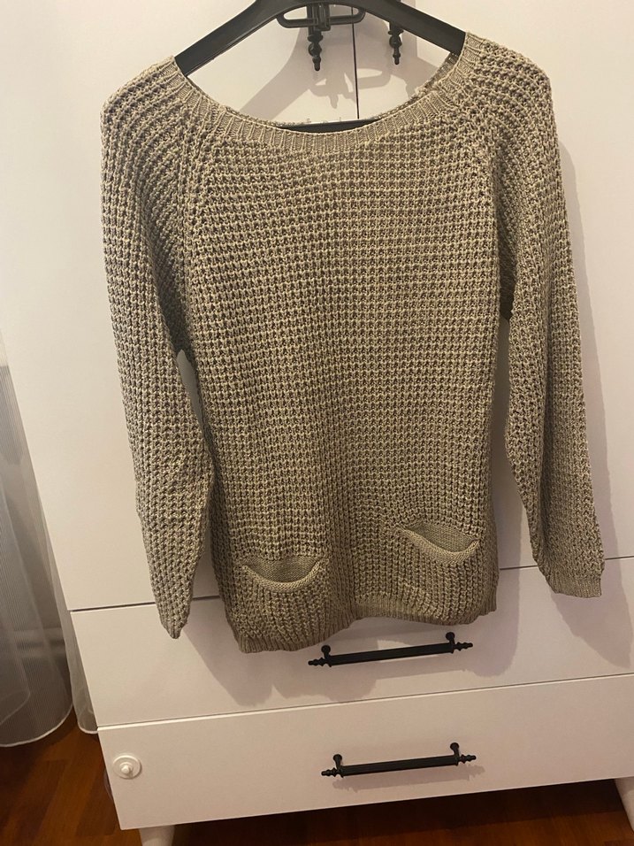 Bej renkli, örgü kadın triko kazak, uzun kollu ve yuvarlak yaka tasarıma sahiptir. Salaş kesimi ve midi boyu ile günlük rahat kullanıma uygundur. Ön kısmında küçük cepler bulunur.