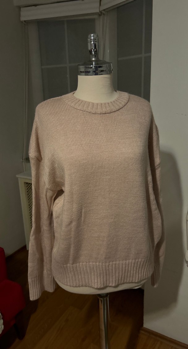 Bej renkli, yuvarlak yaka ve uzun kollu örgü kadın triko sweatshirt, bol kesim ve normal boyda. Rahat ve günlük kullanıma uygun.