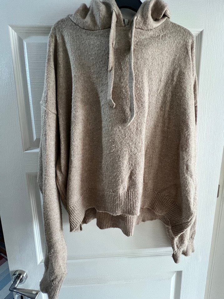 Yumuşak kumaştan, uzun kollu ve yuvarlak yakalı bej örgü triko, rahat kesimiyle günlük sokak stiline uygun.