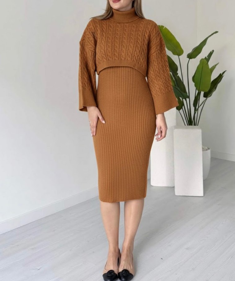 Bej renkli, örgü dokulu, boğazlı ve uzun kollu kadın elbisesi, rahat kesimi ve modern tasarımıyla ofis kullanımı için uygundur.