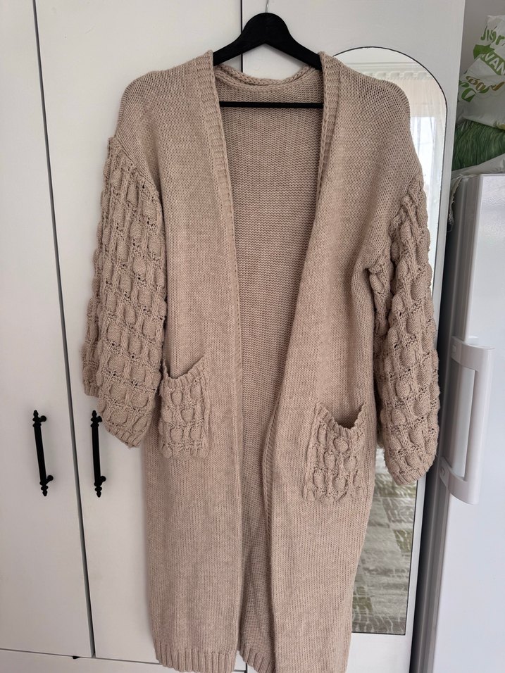 Uzun bej renkli, örgü dokulu, cepli ve uzun kollu, bol kesim kadın hırka. Yaka kısmı notched lapel stilindedir.