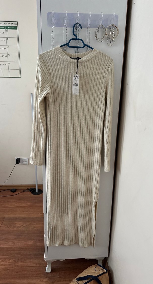 Bej renkli, örgü dokulu uzun kollu elbise. Regular fit kesimi ve yuvarlak yaka ile günlük kullanıma uygun rahat bir modeldir. HİÇ GİYİLMEDİ ETİKETLİ