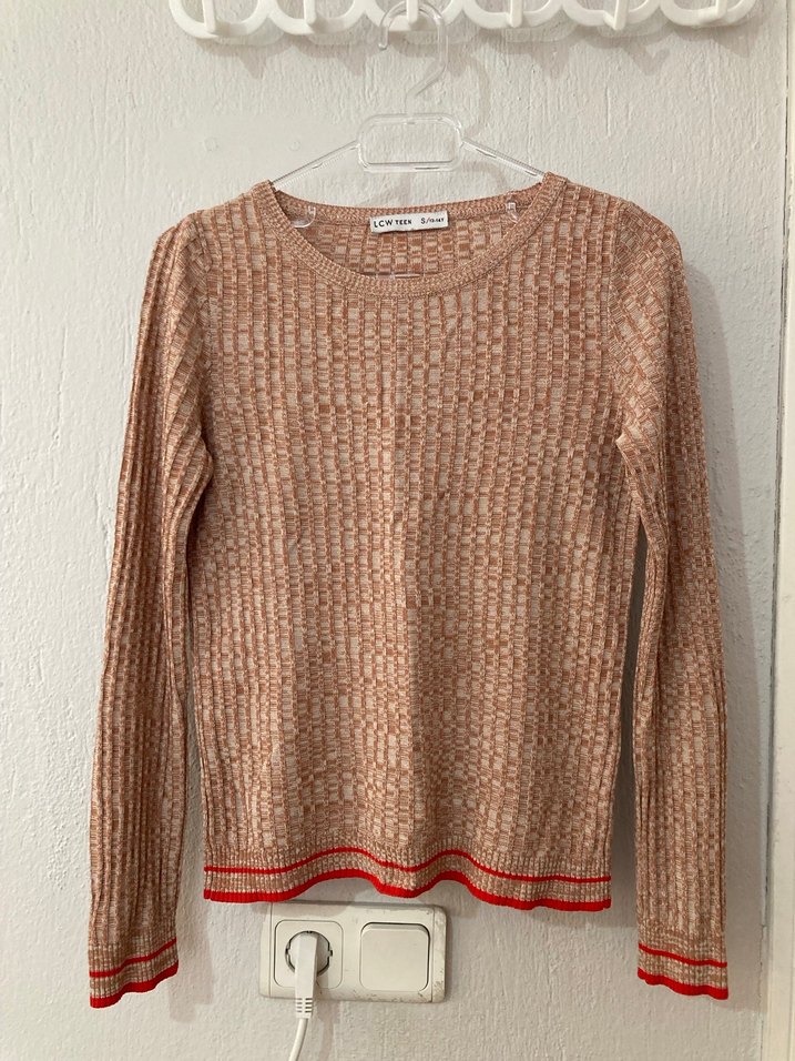 Bej renkli, örgü kadın kazak, uzun kollu ve yuvarlak yakalıdır. Rahat kesimi ve kırmızı detaylarıyla günlük kullanıma uygundur.
