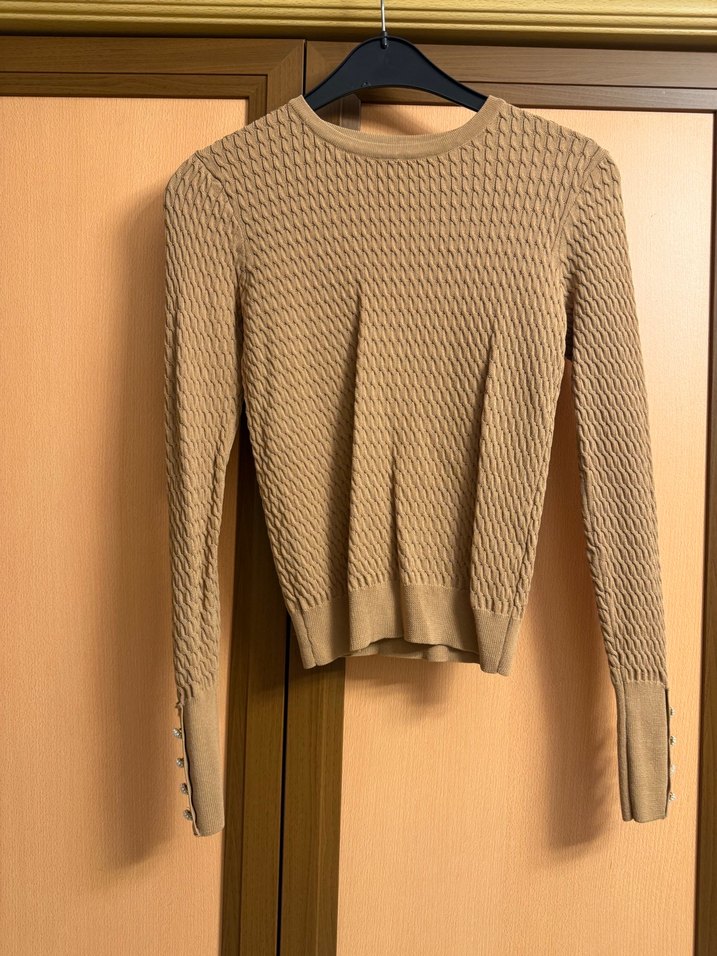 Bej renkli örgü kazak, uzun kollu ve yuvarlak yakalıdır. İnce ve vücuda oturan kesimiyle günlük sokak stiline uygun rahat bir görünüm sunar. Sırttaki Etiketi kesilmiştir ama zaranın ürünüdür
