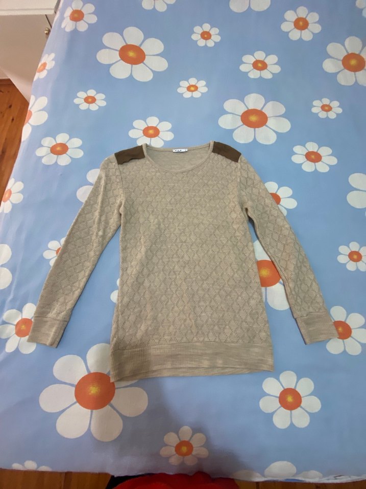 Bej renkli, uzun kollu, yuvarlak yakalı ve örgü yapısında, vücuda oturan kadın sweatshirtü. Günlük kullanım için uygun, rahat sokak stili. M bedene daha iyi olur