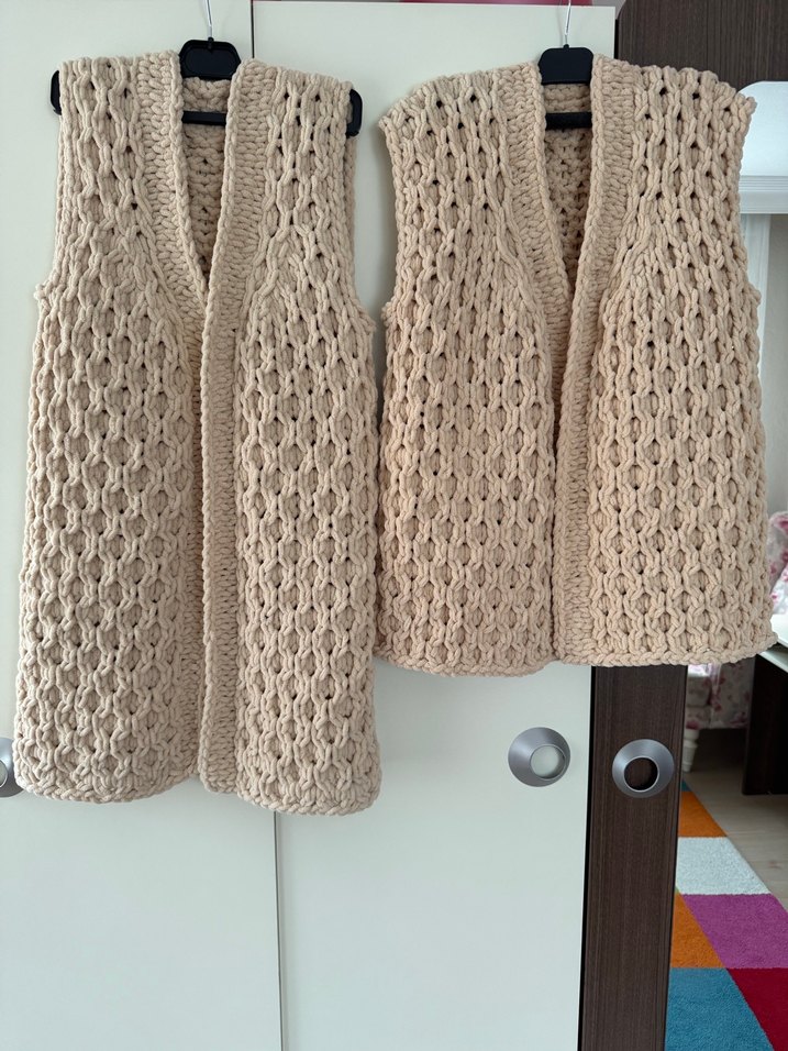 Bej renkli, örgü dokulu, rahat kesim ve kolsuz kadın yeleği. V yaka ve midi boyda, günlük kullanıma uygun bohem tarzda. Kendi elemeği ürünümdür tunik boy s/m uyumlu diğeri 40/42 uyumlu ADET fiyatı