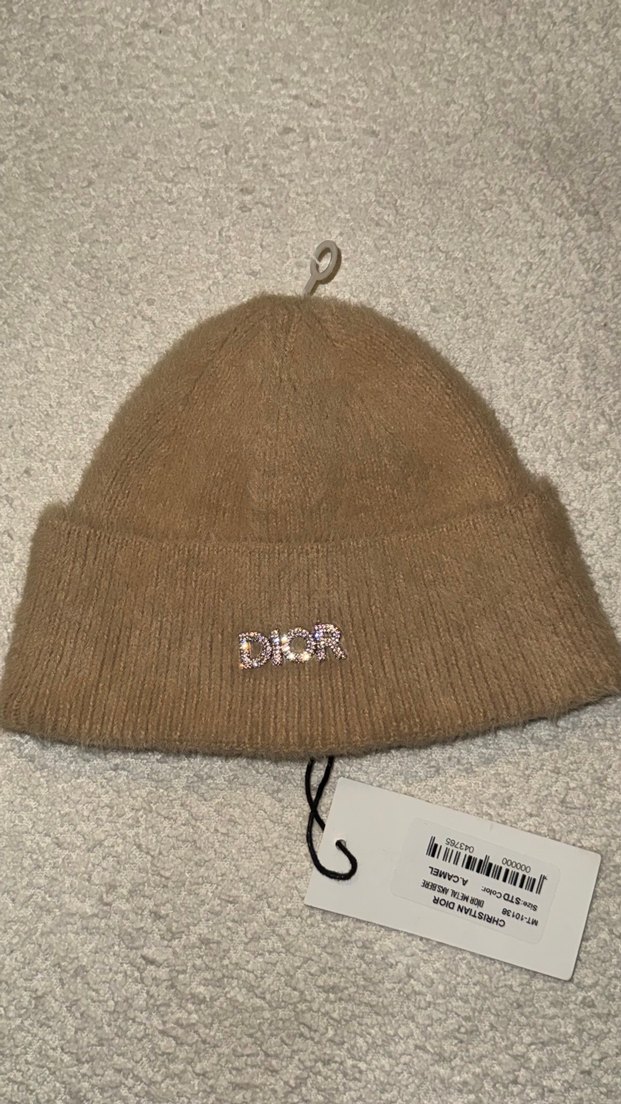 Örgü yünden yapılmış açık bej renkli bere, DIOR logosu ile rahat ve şık bir sokak stili sunar.