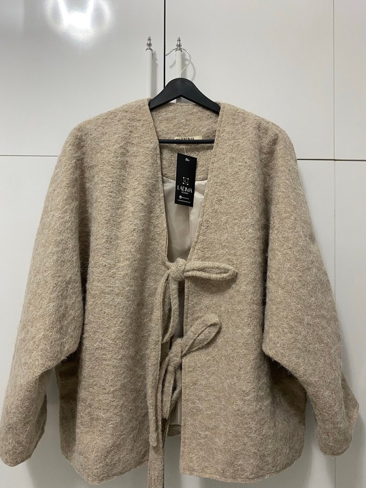 Bej renkli yün kaban, örgü dokulu ve bol kesimdir. Midi boyda, uzun kollu ve yakası kesik yaka şeklindedir. Önde bağlama detayına sahiptir. Standart beden 1 defa kullanıldı ✨