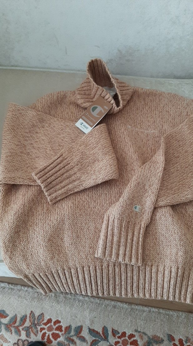 Bej renk, örgü yün kumaştan, bisiklet yaka ve uzun kollu kadın kazak. Rahat ve normcore tarzda, günlük kullanım için ideal. orjinal etiketli