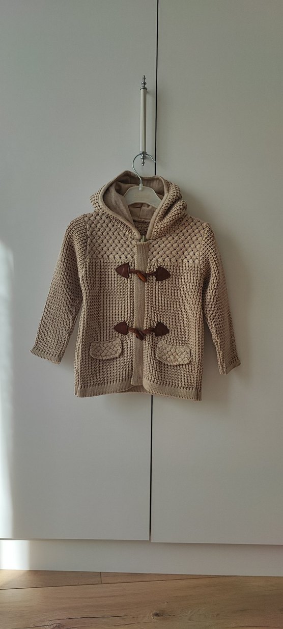 Bej renkli, kapüşonlu ve bol kesim erkek çocuk kabanı. Örgü kumaştan, önünde iki cep ve çıtçıtlı düğmeler bulunur.
