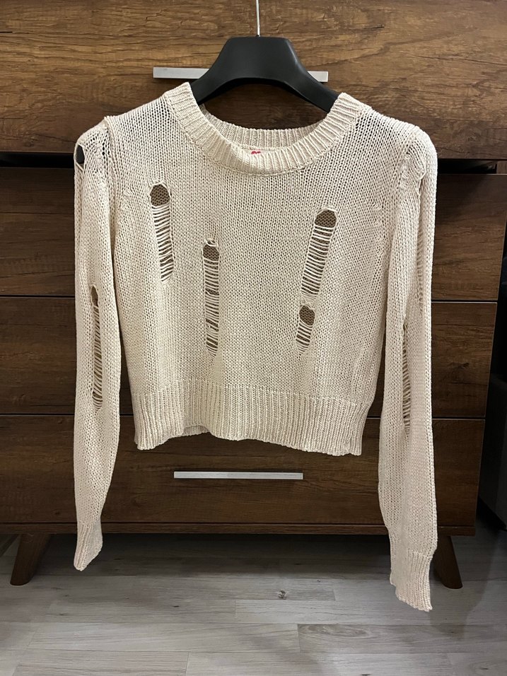 Açık bej renkli, uzun kollu ve yuvarlak yakalı örgü kazak. yırtık detaylarıyla bohem tarzı için uygun. Koton marka M beden