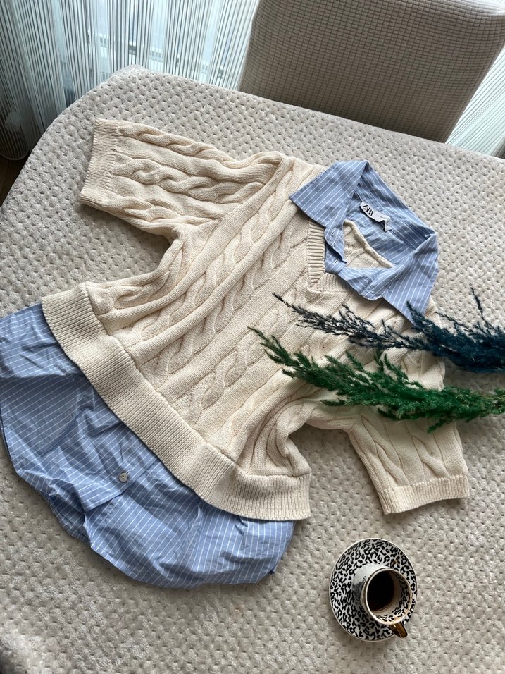 Bej renkli, örgü dokulu, kısa kollu ve kısa uzunlukta, bohem tarzda, bol kesim süveter. Yaka kısmı yakalıdır, rahat ve şık bir görünüm sunar.