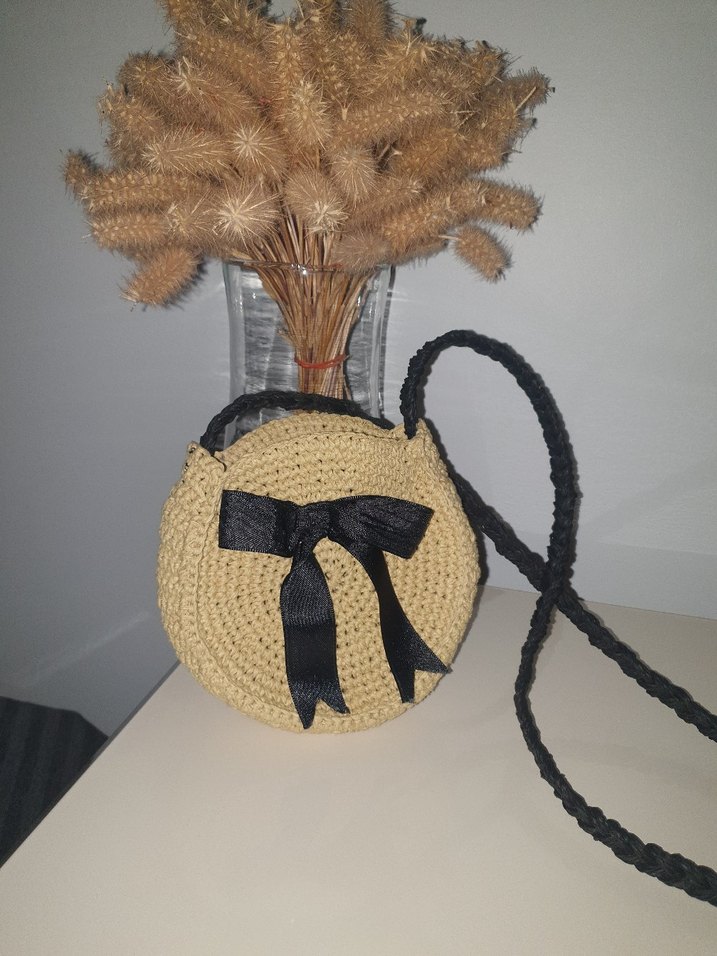Bej renkli, siyah fiyonk süslemeli örgü çantası. Örgülü askısıyla bohem tarzda, günlük kullanım için uygundur.