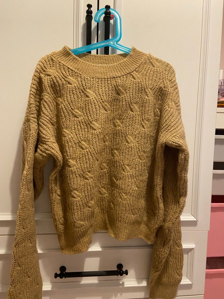Bej renkli, örgü kumaştan, yuvarlak yakalı ve uzun kollu, rahat kesim kadın kazak. Günlük kullanıma uygundur.
