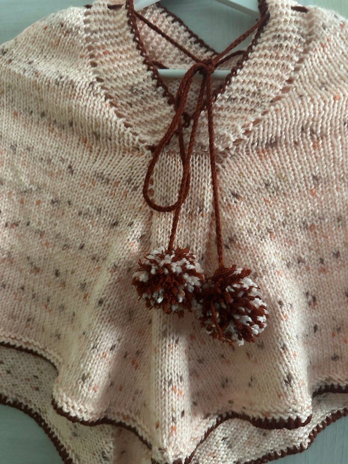 Bej renkli, gevşek kesim örgü kız çocuk pelerini, bisiklet yaka ve askılı kol detayı ile bohem tarzı yansıtır, ponpon süslemelidir.