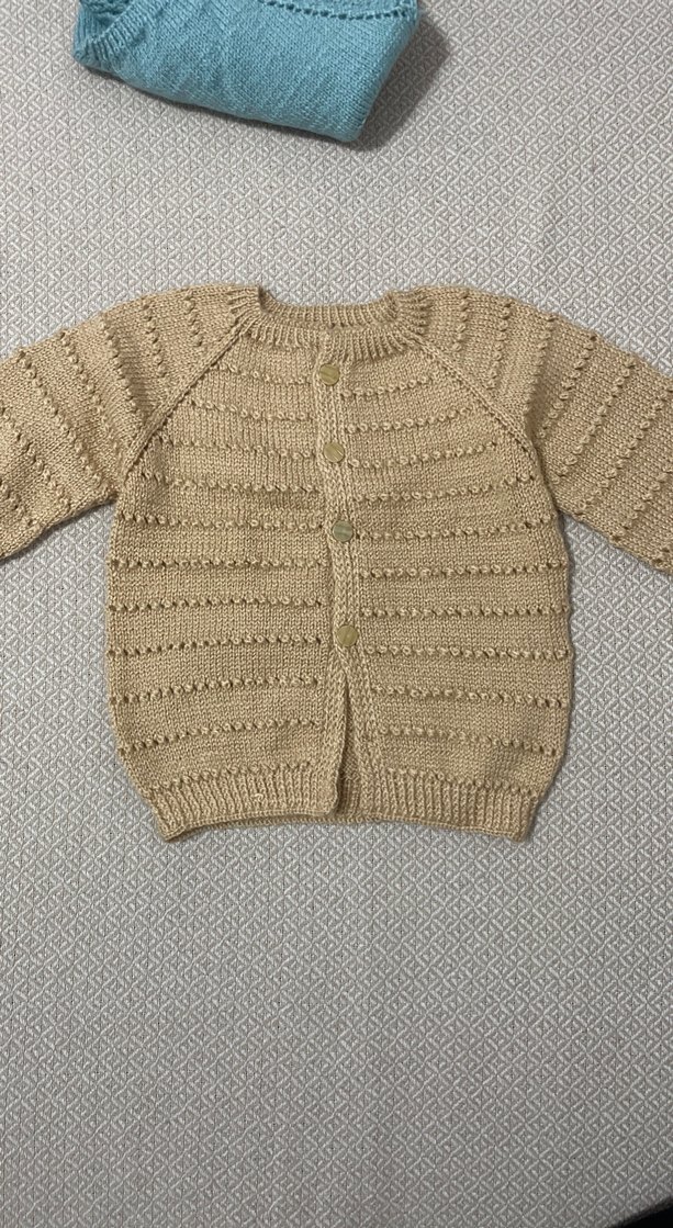 Bej renkli, uzun kollu, örgü kız,erkek çocuk hırkası. Düğmeli ve bol kesim, yumuşak dokulu örme kumaş kullanılmıştır. 1-2 yaş