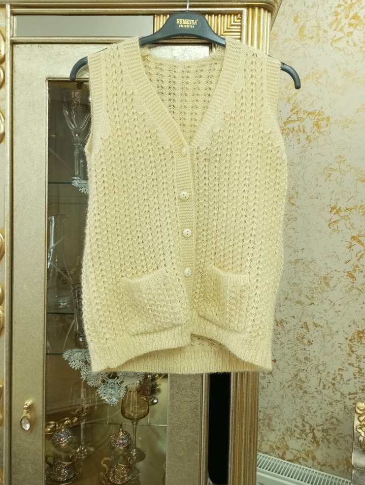 Bej renkli, kolsuz, örgü dokulu, gevşek kesim kadın yelek. Önünde düğme ve cepler bulunur, günlük kullanıma uygun rahat ve bohem tarzda.
