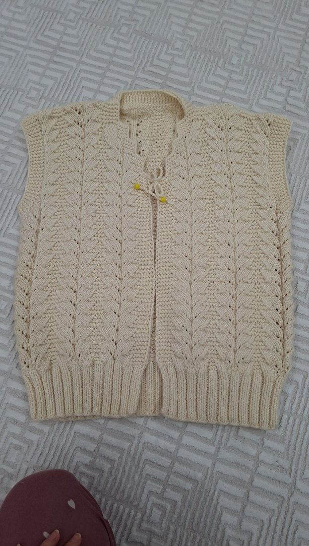 Bej renkli, örgü kolsuz kadın yeleği, V yaka ve kısa boyda. Rahat kesimli, bohem tarzda, günlük kullanıma uygun. el emeği