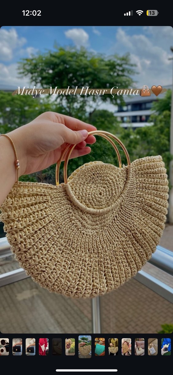 Bej renkli, yuvarlak altın saplı, minimal bohem tarzda örme midye model hasır çanta, günlük kullanıma uygundur.