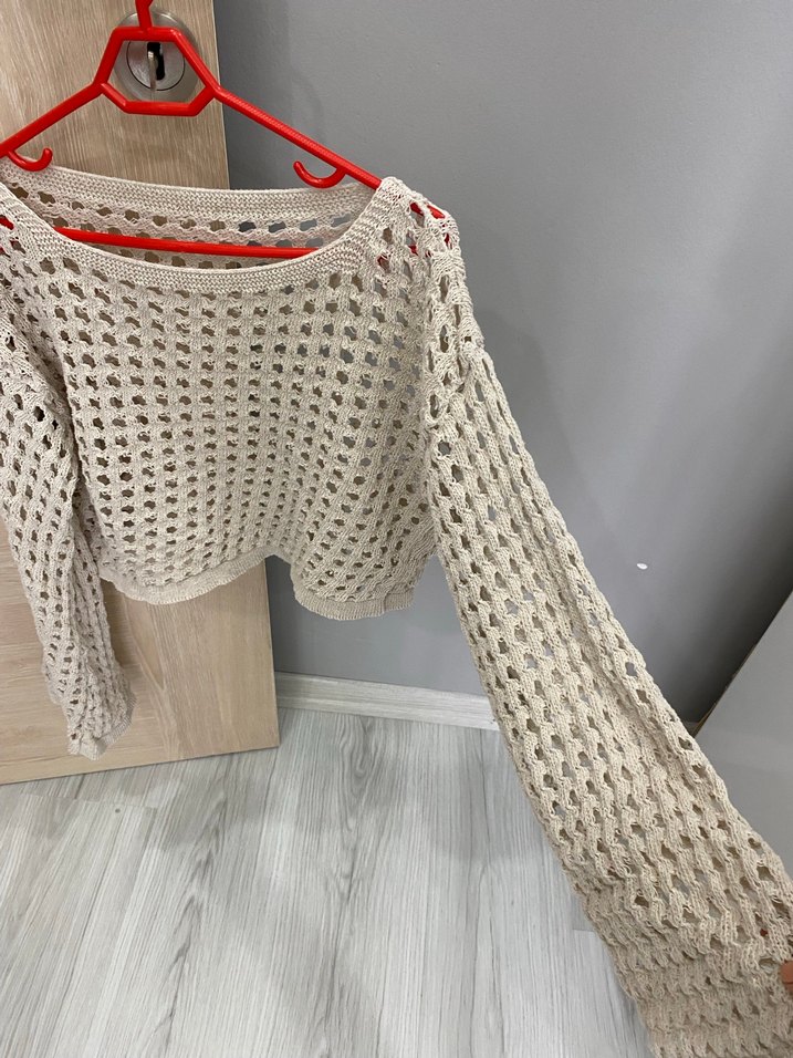 Bej renkli, örgü yapıda, kayık yaka ve uzun kollu, bol kesim mini kazak. Rahat bohem tarzı ve günlük kullanım için uygundur.