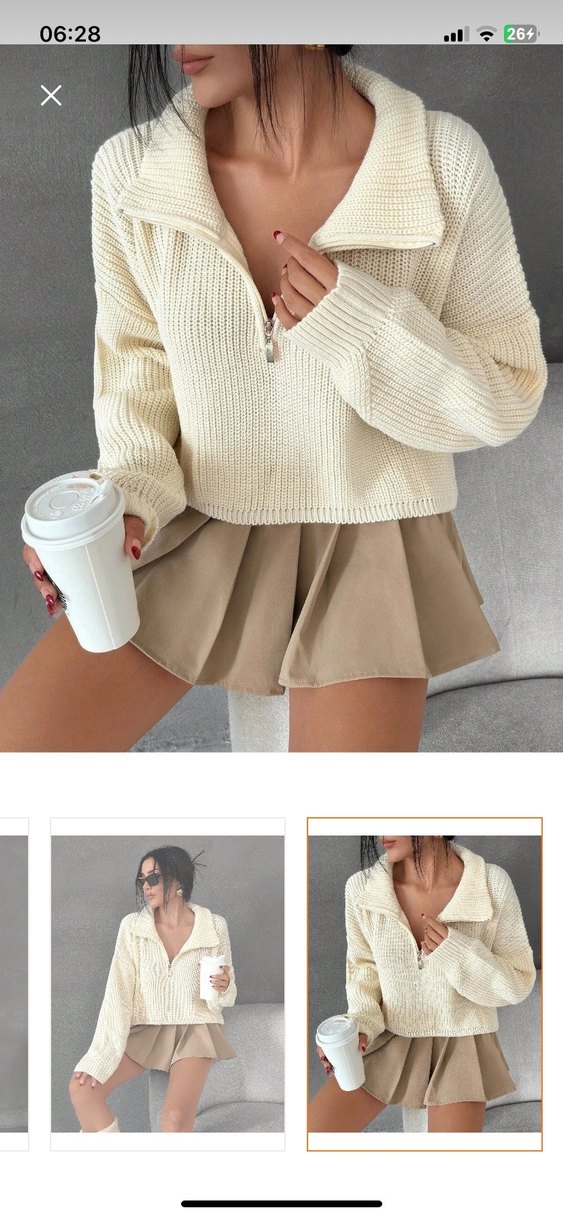 Bej renkli, uzun kollu, yuvarlak yakalı, kısa mini uzunlukta, bol kesim örgü kadın kazak. Günlük ve sokak stiline uygun.