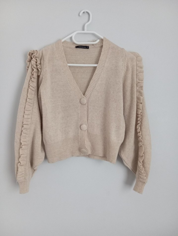 Bej renkli, örgü mini hırka, V yaka ve uzun kollu, fırfır detaylıdır. Rahat ve bol kesim, günlük sokak stili için uygundur.