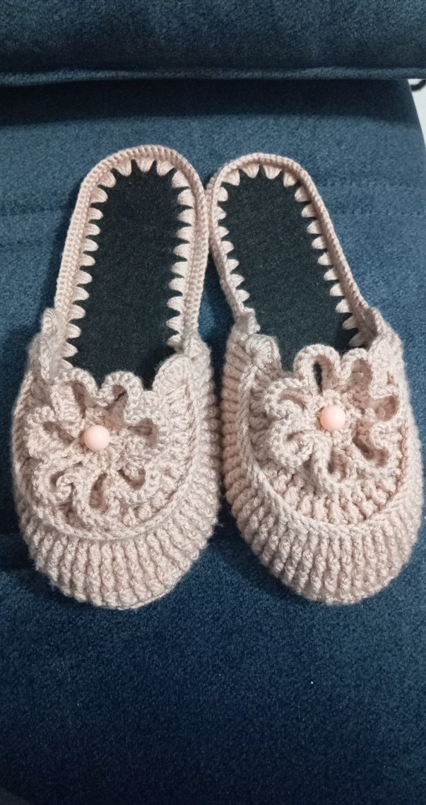 Bej renkli, nakışlı çiçek detaylı örgü kadın ev terliği, ince topuklu ve rahat örgü kumaştan yapılmıştır.