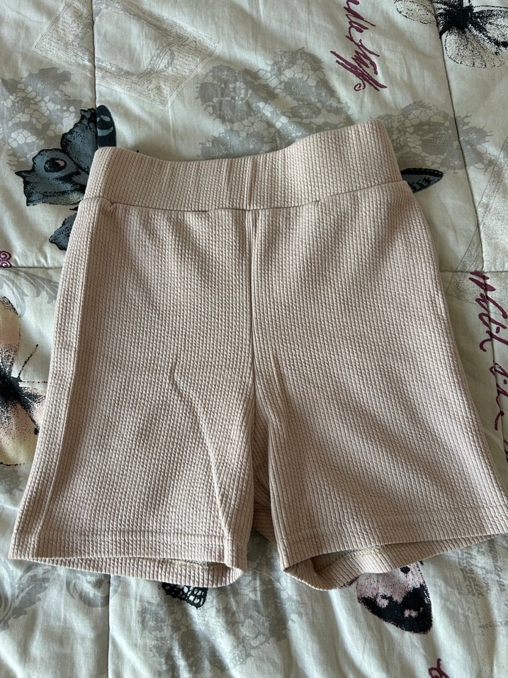 Yumuşak pamuktan bej renkli, örgü dokulu, kısa ve dar kesim hamile şortu. Günlük sokak stiline uygun.