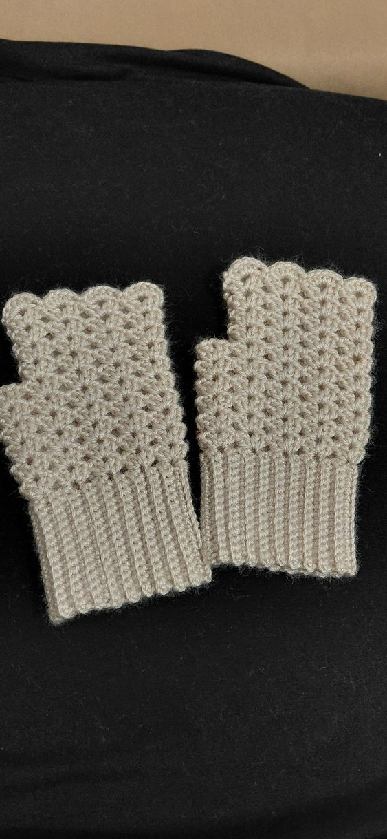 Bej renkli, örgü parmakları açık kadın eldivenleri, yumuşak kumaştan yapılmış rahat ve bohem tarzda bir üründür.