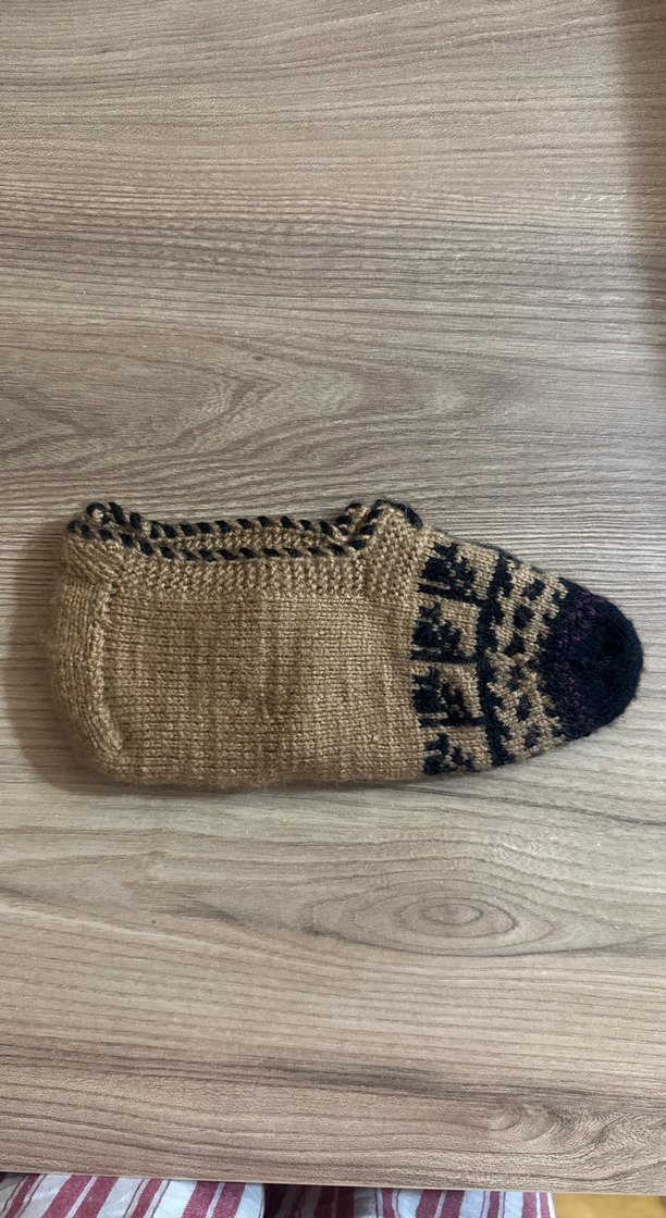 Bej renkte, koyu uçlu örgü yapıda sıcak terlik. Rahat ve konforlu kullanım sunar.