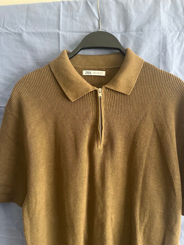 Bej renkli, örgü dokulu polo tişört. Yaka ve kısa kollu, yumuşak keten kumaştan, bol kesim ve normal boyda, gündelik sokak stili için uygun.