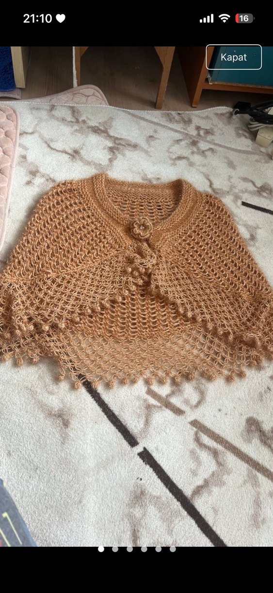 Bej renkli, işlemeli örgü poncho, yuvarlak yaka ve uzun kolludur. Bol kesimiyle bohem tarzını yansıtır.