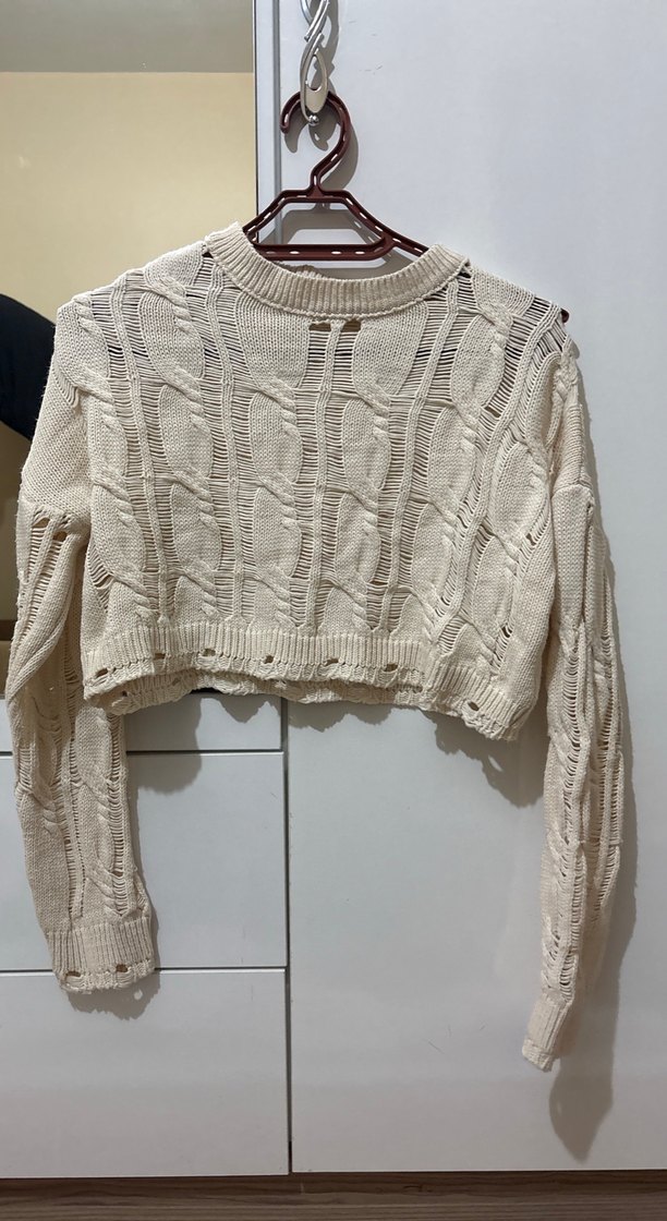 Bej renkli, örgü dokulu, yuvarlak yakalı, uzun kollu ve rahat kesim kısa uzunlukta kadın kazak.