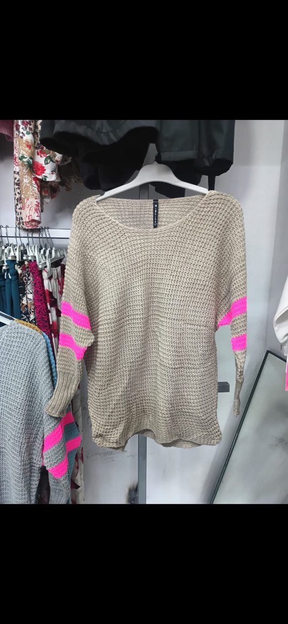 Bej renkli, uzun kollu ve pembe şerit detaylı örgü kadın kazak. Salaş kesim ve normal midi boyda, rahat sokak stili için uygun.
